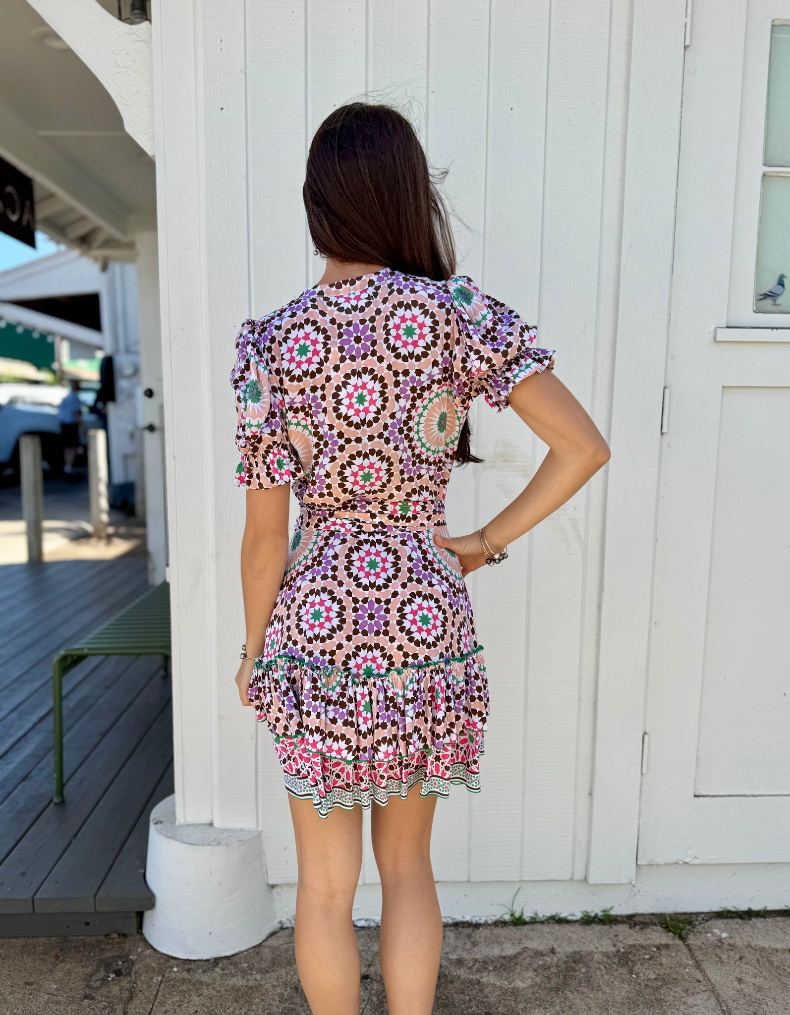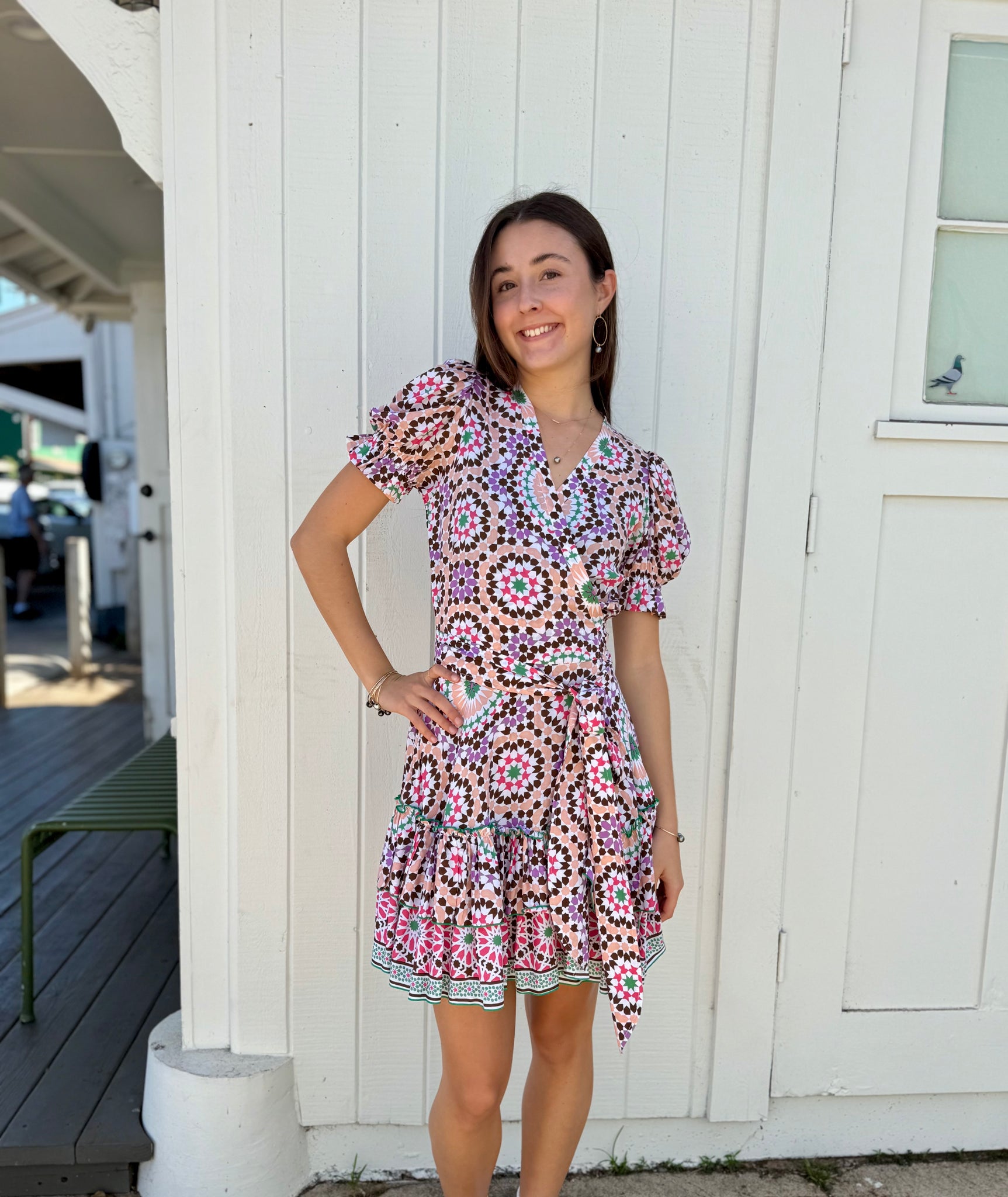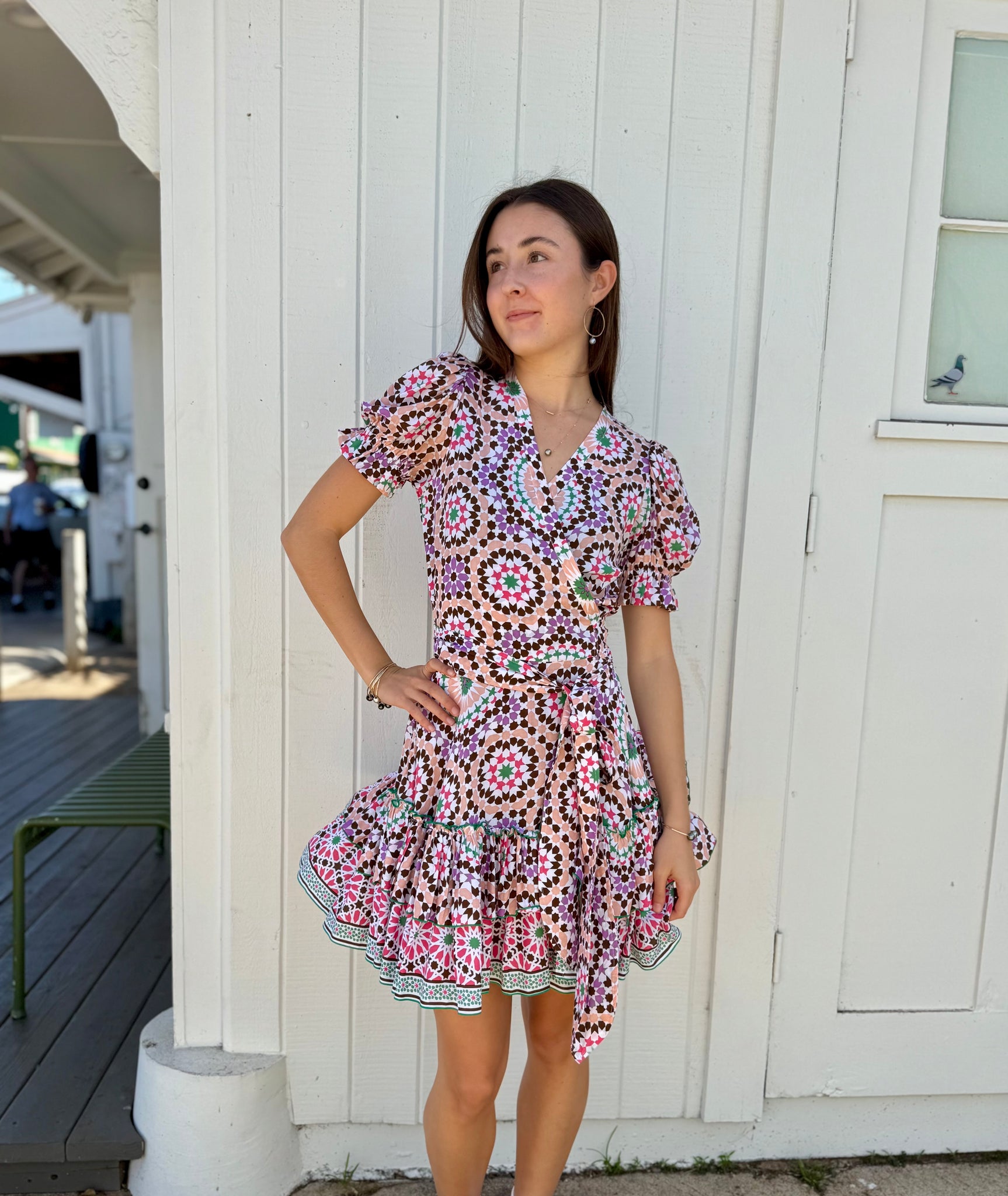 The Sultana is a short wrap dress cut in breathable super rayon fabric. It features blouson sleeves with elasticated cuffs, a V-neckline, and an adjustable tie waist. The skirt falls to a soft, swishy mini length for easy movement. Wrap style with a waist tie. Unlined and fits true to size.