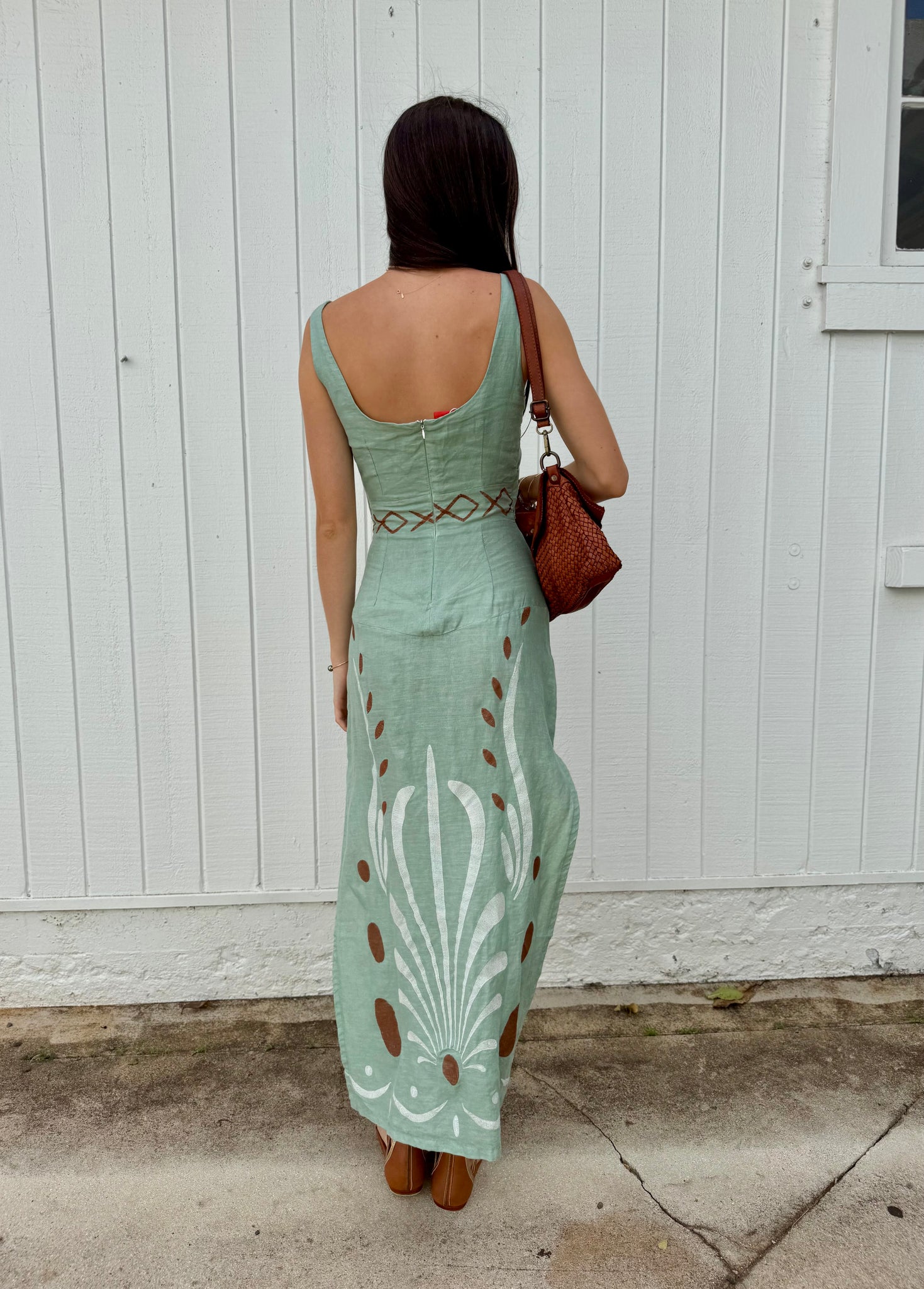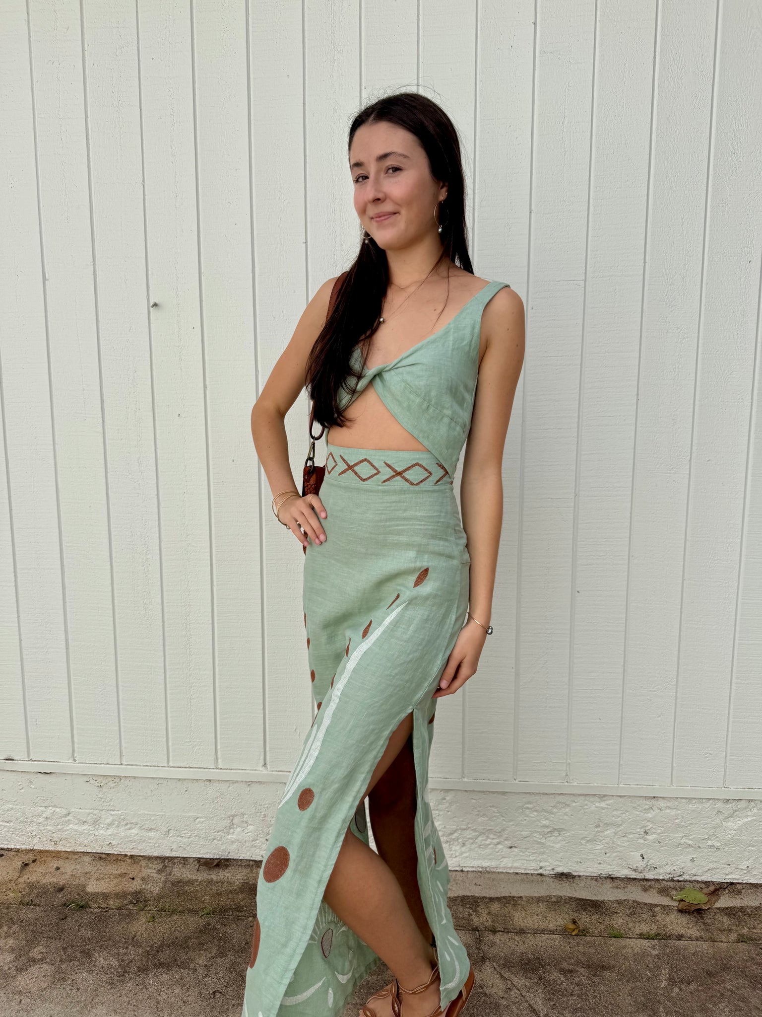 Effortless Greek island elegance in premium 100% linen. This sage-green maxi features a sleeveless twist-front bodice with subtle midriff cut-out, flowing skirt with high side slit, and hand-embroidered white botanical motifs accented by terracotta geometric borders—blending ancient heritage with modern boho charm.