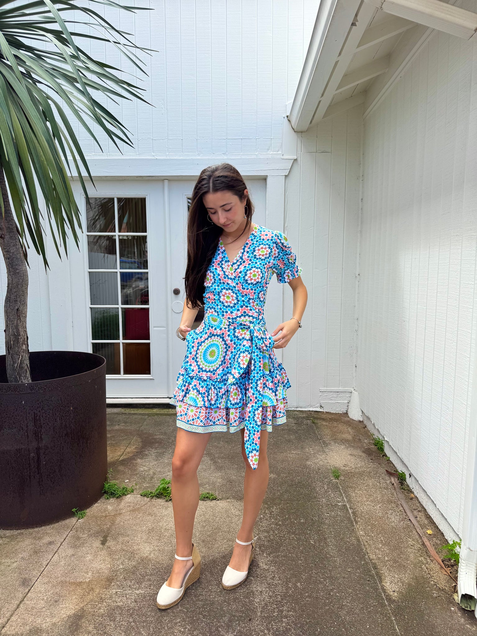 The Sultana is a short wrap dress cut in breathable super rayon fabric. It features blouson sleeves with elasticated cuffs, a V-neckline, and an adjustable tie waist. The skirt falls to a soft, swishy mini length for easy movement. Wrap style with a waist tie. Unlined and fits true to size. In the new Peace For The Planet print!