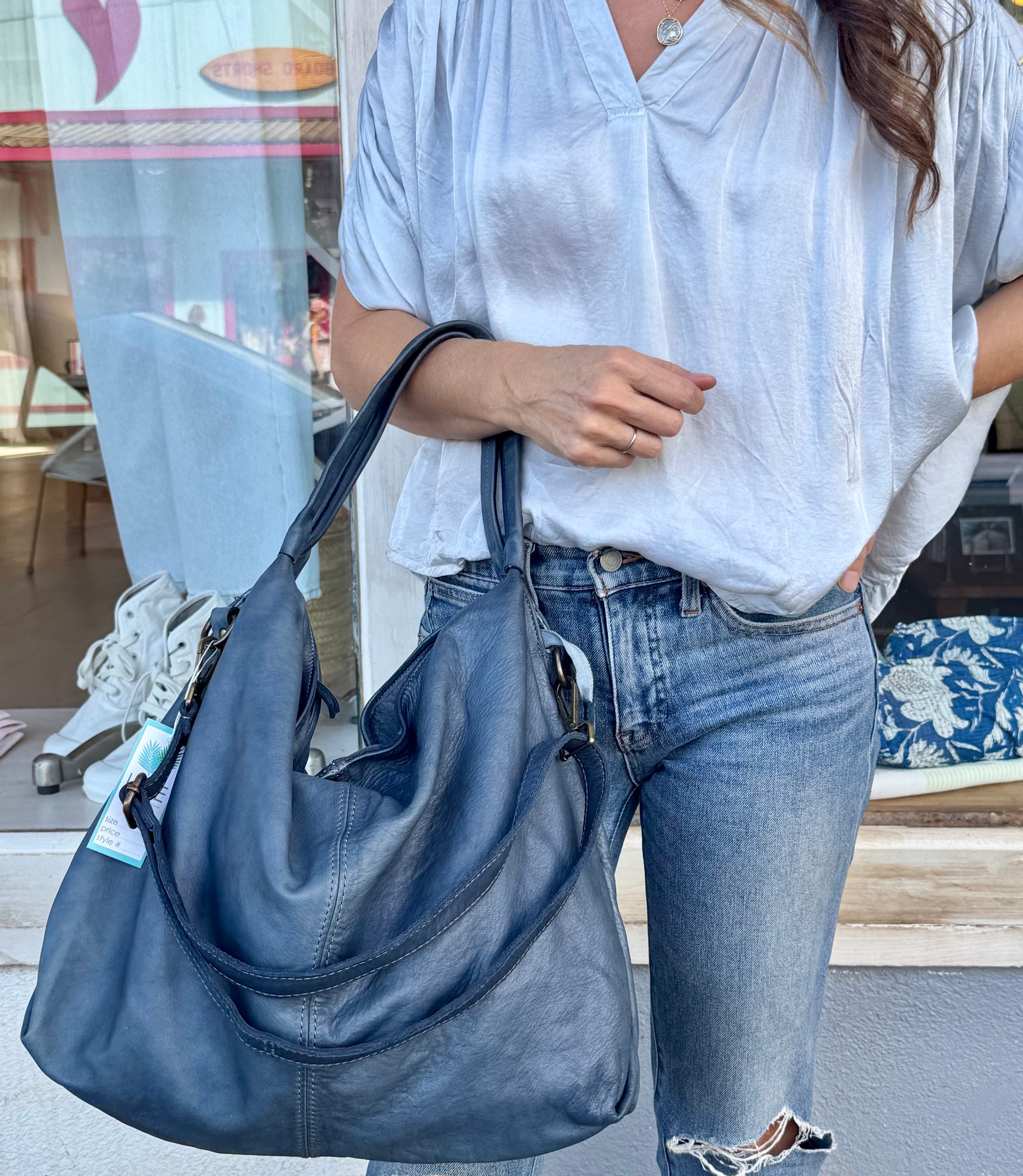 Denim blue Italian leather bag, made in Italy. Shoulder strap is adjustable and removable. Zipper closure. Internal zip pocket and mobile phone pocket. Bag size: (cm) HxWxD: 34 41 9cm